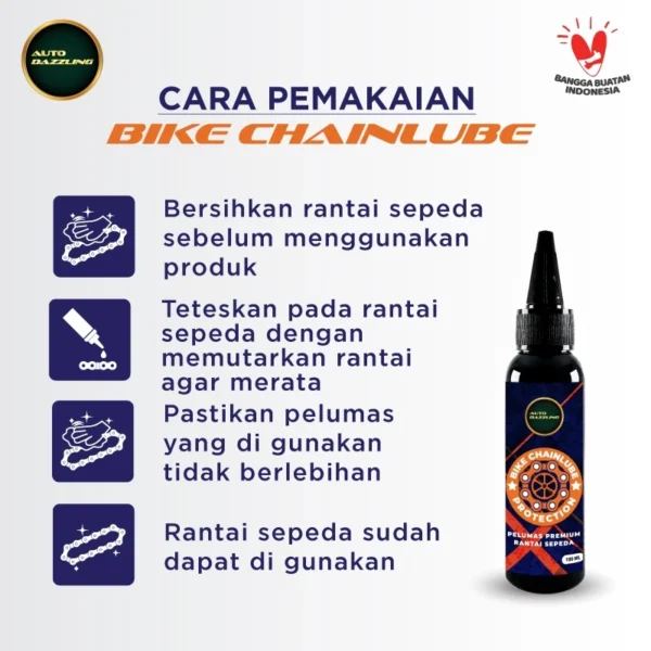 AUTODAZZLING BIKE LUBRICANT PELUMAS RANTE SEPEDA PREMUM PLUS PROTECTION Merupakan pelumas rantai sepeda yang tahan lama bisa digunakan untuk sepeda lipat, mountain bike, roadbike, dan sepeda lainnya, fungsi lainnya mencegah korosi pada rantai, memperpanjang usia pakai rantai dan gear sepeda dengan mencegah munculnya karat.