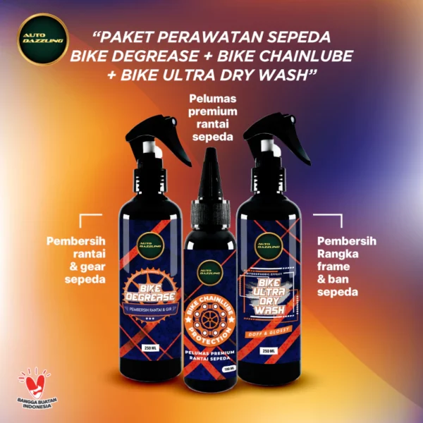 Tersedia varian paket lengkap lebih hemat 3 produk untuk perawatan sepeda sehari – hari.
