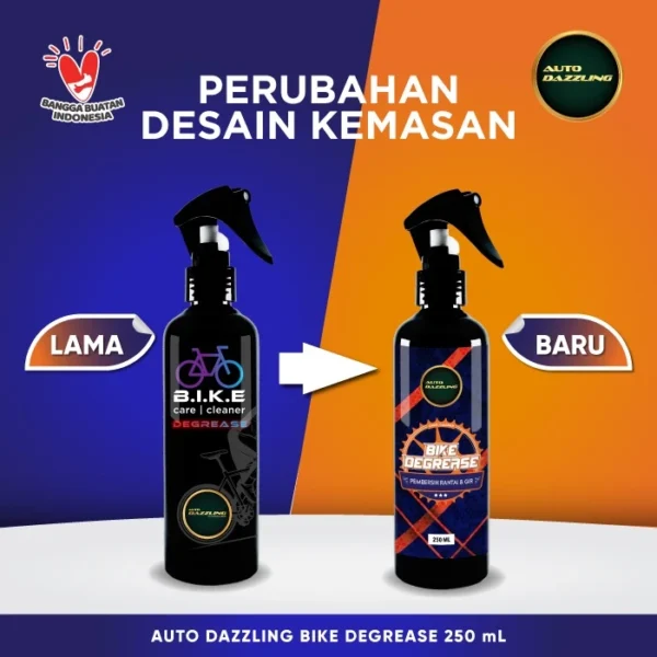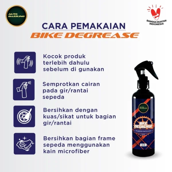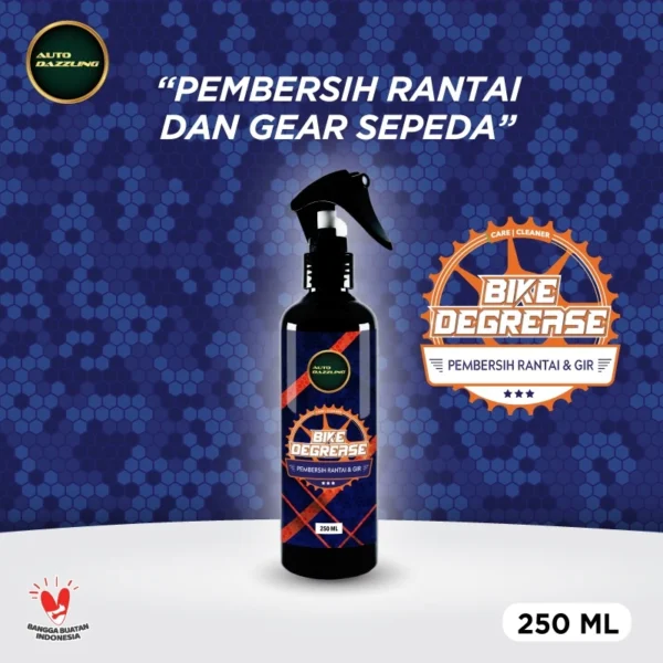 AUTODAZZLING BIKE DEGREASE Merupakan cairan yang di formulasikan khusus untuk membersihkan rantai dan gir sepeda. mampu membersihkan kotoran dan minyak bekas pelumas pada sepeda, bebas dari korosi aman buat karet dan brake pads karena tidak mengandung oil.