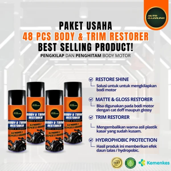 Auto Dazzling Trim & Bodi Restorer 48 Pcs solusi untuk bodi motor kamu untuk mengkilapkan kembali, bisa untuk bodi glossy dan doff. untuk di permukaan bodi plastik kasar hitam juga bisa menghitamkan kembali. Hasil produk ini memberikan efek daun talas / hydropobic.