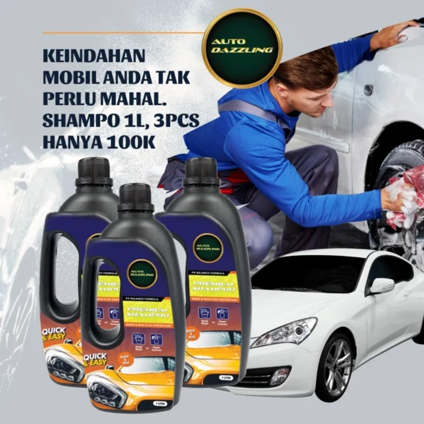 Auto Dazzling Promo Bundling 3 pcs Premium Shampo ukuran 1 Liter Premium Shampo merupakan shampo atau sabun kendaraan terbaik berkualitas tinggi menjadi solusi sempurna untuk menjaga kendaraan Anda tetap bersih dan terawat. Dirancang khusus dengan formula yang efektif membersihkan kotoran, noda, dan bekas lumpur di permukaan kendaraan tanpa merusak lapisan cat atau menggores bodi.